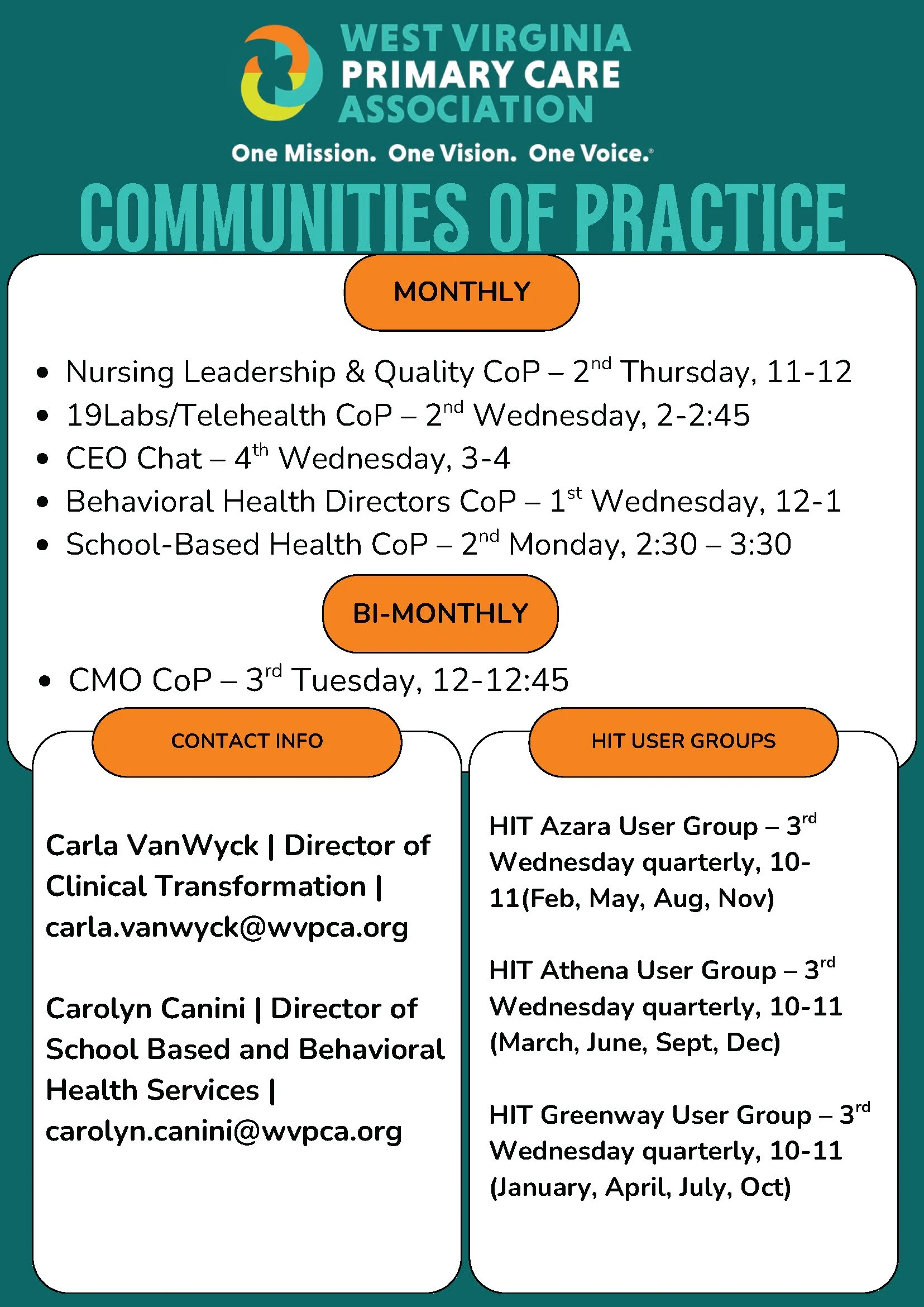 WVPCA Communities of Practice provide time for individuals from CHCs around the state to gather, collaborate, and learn together. Below, you will find information about what Communities of Practice meet, their schedule, and contact information for the organizers from the WVPCA.